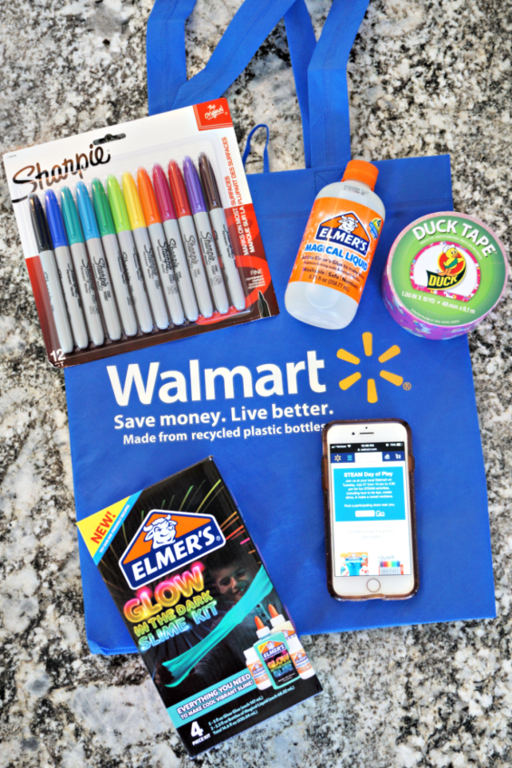 The STEAM events at Walmart feature fun and engaging activities for kids of all ages. You and your kids will be able to make colorful Tie-Dye Shirts using Hanes T-shirts (10am-2pm), or Slime with Elmer’s Slime Kits (2pm-4:30) or Cereal Necklace’s with Great Value cereals (10:30am-4:30pm.) While Kids enjoy making fun things, parents can enjoy saving money on back-to-school essentials from trusted brands including Sharpie, Hanes, ALL detergent, Ziploc, Duck Tape, and more. My son has wanted to make slime all summer long. I saw Elmer’s Slime Kits at Walmart and couldn’t resist getting one for us to try. The kits include everything you need to make cool slime in 4 easy steps. We made “Glow in the Dark” slime. It really does glow nice and bright in the dark!